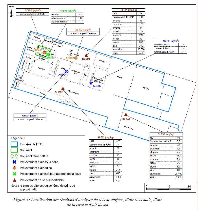 Cette démarche s'est inscrite dans le cadre de l'action 19 du 2e plan national santé environnement 2009-2013 et de l'article 43 de la loi 2009-967 du 3 août 2009 de programmation relative à la mise en œuvre du Grenelle de l'environnement. Influence potentielle des anciens sites industriels sur l’établissement scolaire S’agissant d’une école primaire privée sans jardin pédagogique ni logement de fonction, trois scénarios d’exposition sont à considérer. Deux scénarios sont retenus : - l'inhalation de l'air dans les bâtiments, air qui serait susceptible d'être dégradé par des pollutions éventuelles provenant des sites industriels historiques : Les activités exercées par le passé au voisinage de l’établissement scolaire sont susceptibles d’avoir utilisé des composés volatils qui peuvent être transférés sous forme d’émanations gazeuses depuis les sols ou les eaux souterraines vers la surface et ainsi influencer la qualité de l’air intérieur au droit de l’établissement. Le scénario d’exposition par inhalation est donc retenu ; - l’ingestion de sols par les enfants : Le scénario d’exposition par ingestion de sols superficiels a été retenu du fait de l’âge des enfants (inférieur à 6 ans) pour lequel le porté main-bouche est pertinent et de la présence de sols nus accessibles dans les cours de récréation et le jardin récréatif de l’établissement susceptibles d’avoir été dégradés par d’éventuelles émissions atmosphériques et/ou projections provenant de la fonderie présente en contiguïté au nord de l’établissement. Un scénario d’exposition n’a pas été retenu : - l’ingestion d’eau par les enfants : Les réseaux d’eau potable ne traversant pas l’emprise des sites industriels identifiés, la possibilité d’une dégradation de la qualité de l’eau du robinet par transfert de polluants au travers des canalisations n’est pas retenue. Considérant qu'il existait des potentialités d’exposition des populations fréquentant l’établissement par inhalation de vapeurs et ingestion de sol, l’établissement a fait l’objet d’une campagne de diagnostic sur les milieux pertinents (phase 2) à l’issue de la phase 1. Les milieux retenus sont : - les sols superficiels à nu du jardin récréatif et des cours de récréation, - l’air sous dalle dans les locaux de l’école, - l’air du sol à proximité de la chaufferie au fuel de l’établissement, - l’air du sol et l’air intérieur au droit de la cave de l’école. Les substances recherchées dans les milieux investigués étaient celles susceptibles d’être présentes en lien avec les activités des sites BASIAS identifiés en contiguïté ou à proximité de l’établissement. Les résultats ont été interprétés conformément au guide de gestion des résultats des diagnostics réalisés dans les lieux accueillant des enfants et adolescents (BRGM, ADEME, INERIS, InVS) de juin 2011 et à la note ministérielle du 8 février 2007 définissant le cadre général de la politique nationale en matière de gestion des sites et sols pollués. Les investigations ont montré les éléments suivants : o des composés volatils ont été détectés localement dans l’air sous dalle et dans l’air de la cave, dans un ou plusieurs des échantillons prélevés au droit du bâtiment principal de l’école primaire. Les concentrations mesurées sont inférieures aux bornes basses des intervalles de gestion et ne posent donc pas de problème de qualité de l’air intérieur. Ces résultats permettent donc d’écarter le scénario d’exposition potentielle par inhalation de vapeurs. o des composés, dont le plomb, ont été quantifiés localement dans les sols superficiels au droit de l’établissement à des teneurs supérieures à celles mesurées dans les échantillons témoins et aux référentiels bibliographiques. En vue de réduire l’exposition au plomb de la population française, les autorités sanitaires au niveau national mènent actuellement des travaux pour réévaluer l’ensemble des valeurs de gestion aujourd’hui en vigueur sur le plomb. Le Haut Conseil de la Santé Publique a dans son avis du 23 mai 2014 préconisé une politique de réduction des expositions au plomb au plus bas niveau possible et une politique de surveillance de la population. Par lettre du 19/10/2015, le préfet des Hautes-Pyrénées a recommandé au maître d'ouvrage du groupe scolaire de réduire autant que possible l'exposition des personnes fréquentant l'établissement par des mesures environnementales. Ainsi, à titre conservatoire, il est recommandé de restreindre les accès aux espaces verts concernés par ces teneurs en plomb supérieures à 100 mg/kg avec des clôtures et/ou barrières, puis il convient soit de recouvrir les sols végétalisés par un matériau synthétique, soit de remplacer les terres en place (sur 30 centimètres) par des terres d'apport dont la qualité sera contrôlée avec mise en place d'un grillage avertisseur. Pour tous les autres composés, la gestion des résultats, en considérant un scénario d’ingestion de sol indique que la qualité des sols est compatible avec l’usage actuel. Pour les sols, l’école primaire Sainte Thérèse (n°0650670A) à Tarbes est classée en catégorie B c'est à dire que les aménagements et les usages actuels permettent de protéger les personnes des expositions aux pollutions, que les pollutions soient potentielles ou avérées. Des modalités de gestion de l'information doivent cependant être mises en place pour expliquer ce qui doit être fait si les aménagements ou les usages des lieux venaient à être modifiés." Ce classement permet de conserver la mémoire des résultats de ce diagnostic et d'engager les actions préconisées par la lettre du 19/10/2015. Cet avis concerne la configuration actuelle de l’établissement et se base sur les connaissances techniques et sc