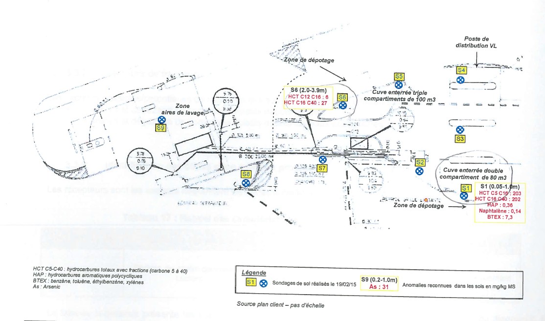 Un diagnostic des sols réalisé en mars 2015 mettait en évidence un impact jusqu'à un mètre de profondeur au niveau de la zone de dépotage et en bordure de la cuve enterrée de la cuve SP : 350mg/Kg en hydrocarbures totaux, 57 mg/Kg en hydrocarbures volatils, 0,36 en hydrocarbures aromatiques polycycliques (HAP) et 7,3 mg/Kg en Benzène Toluène Éthylbenzène Xylènes (BTEX), ainsi qu'un autre impact au niveau de la zone dépotage de la cuve enterrée de gazole entre 2 et 3,9m : 35mg/Kg en hydrocarbures totaux. Les cuves ont été inertées les 9 et 10 septembre 2015, puis démantelées le 15 septembre 2015. Des travaux d’excavation ont eu lieu dans la zone de contamination au droit de la zone de dépotage d’une cuve de carburant enterrée. Un diagnostic complémentaire a porté sur 5 points de sondage dans la zone de dépotage de l’essence sans-plomb en date du 16 septembre 2015 en bordure de fouille de terrassement, en fond de fouille et sur les terres excavées. Les résultats des analyses de sols montrent des valeurs en hydrocarbures totaux de 16 mg/Kg jusque 507 mg/Kg. Les hydrocarbures volatils et les BTEX ne dépassent pour aucun des points de sondage les limites de quantification. Le bureau d’études conclut a une contamination résiduelle diffuse en paroi sud de la fouille de terrassement pour les hydrocarbures totaux. Le bureau d'études recommande, par ailleurs, de faire une analyse des risques résiduelle au regard du futur usage envisagé jugé peu sensible (parking) et de conserver la mémoire sur la zone de contamination diffuse avec la gestion des déblais en cas de travaux ultérieurs dans la zone. |