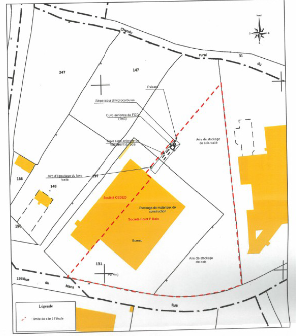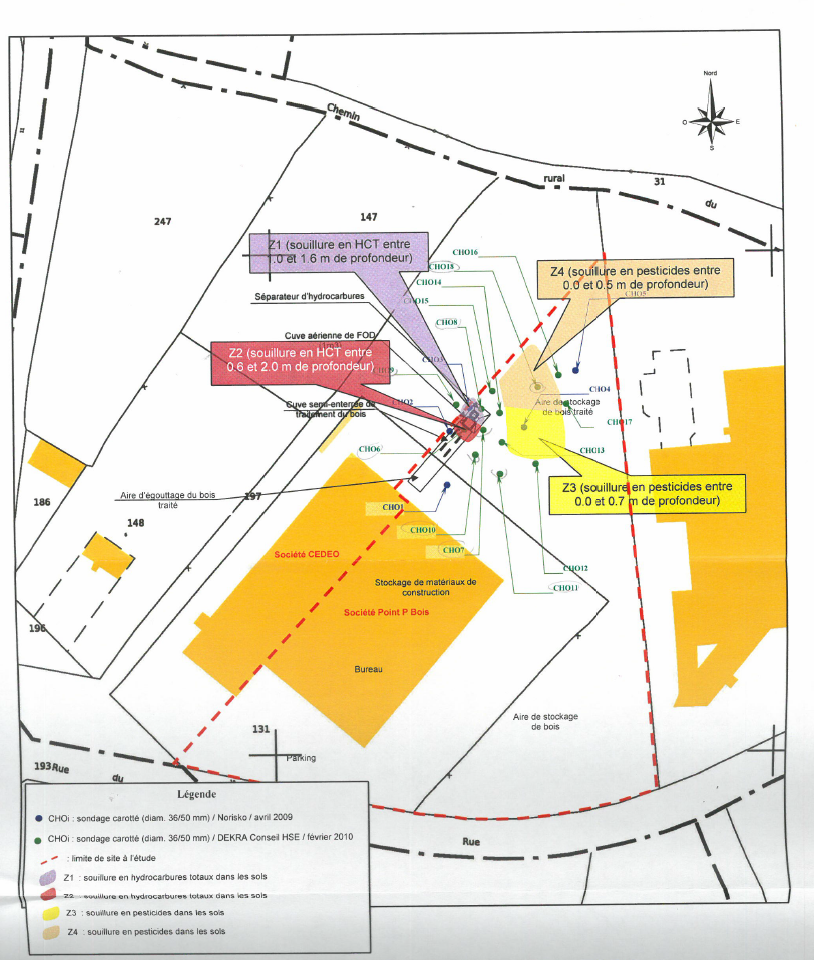 Dans le cadre d'un réaménagement du secteur des cuves de traitement du bois et stockage de fioul (imperméabilisation de surface), une campagne d’investigation des sols a été effectuée le 14 mars 2002. Ce diagnostic sol, remis en mars 2002, a mis en évidence une zone contaminée par la présence de traces d'hydrocarbures, de tébuconazole, propiconazole et cypermethrine. A noter, qu'avant 1998, un fongicide-insecticide était utilisé, contenant notamment les composants actifs-traceurs suivant : Cyperméthrine- Propiconazole- Tébuconazole. Après 1998, un autre fongicide-insecticide était utilisé, contenant également le même type de composants actifs-traceurs : - Perméthrine- Propiconazole. Ce produit était stocké dans une cuve aérienne, dont le sol au voisinage de la cuve n'était pas imperméabilisé. Par ailleurs, 2 cuves aériennes de fioul d'un volume total de 2500L, étaient également posées à même le sol. Durant la campagne d’investigation des sols, 3 tranchées ont été réalisées avec une profondeur variant entre 0,5 m et 0,8m (voir plan cartographique 3) : TR2 et TR3, aux abords de la cuve de traitement de bois, et, TR1, aux abords des cuves de fioul. Les résultats ont montré : _ la présence de traces d'hydrocarbures avec la teneur la plus significative mesurée à 347 mg/kg MS _ la présence notable de Propiconazole (0,09 mg/kg), de Tébuconazole (0,072 mg/kg) et de Cyperméthrine (0,222 mg/kg), soit une teneur totale mesurée à 0,384 mg/kg MS au niveau de TR1. La société Point P Trouillard a procédé à l'excavation des sols impactés, avant réaménagement et imperméabilisation de la zone de traitement de bois et de stockage de fuel. Les sols excavés ont été traités en centre de traitement spécialisé agréé. Le volume de sols pollués excavé est d'environ 15 m³. Dans le cadre de la cessation d’activités, des investigations de terrain ont été réalisées en 2009 et 2010. Un diagnostic des sols est effectué le 16 avril 2009 par un bureau d'étude. Six sondages ont été réalisés au droit des zones à risques d'une profondeur allant jusqu'à 3 mètres (voir plan cartographique 2). Les sondages ont révélé une pollution des sols aux abords du séparateur d'hydrocarbures (présence d'hydrocarbures) et de l'aire de bois traité (présence d'hydrocarbures et de pesticides). Concernant les hydrocarbures, les teneurs s'élevant à 904 mg/kg MS ont été analysées (au niveau du sondage CHO4). Concernant les pesticides, des concentrations significatives de l'ordre de 2,6 mg/kg MS ont été détectées (au niveau du sondage CHO4). Enfin, sur la quasi-totalité des sondages réalisés, il a été constaté la présence de remblais associés ponctuellement à des mâchefers. Les analyses effectuées sur certains sondages ont révélé la présence d'éléments traces métalliques (As, Cd, Cr, Hg, Pb et Zn) en concentrations plus ou moins significatives et d'hydrocarbures aromatiques polycycliques (HAP). À certains points d'échantillonnage (CHO2 et CHO5), de l'Arsenic (52,3 mg/kg) et du Chrome (154,8 mg/kg) ont été détectés, ainsi que du Mercure (0,425 mg/kg). D'après les éléments du dossier, ces matériaux (mâchefers) sont à priori généralisables à l'ensemble du site. Le terrain a été rehaussé par apport de matériaux divers sur une épaisseur variant de 1 à 2 m. Ce remblaiement est antérieur au début d'exploitation du site par la société Point P TROUILLARD. Des investigations de terrain complémentaires ont été réalisées en février 2010 en vue de déterminer l'étendue de la pollution. Treize sondages ont été réalisés (voir plan cartographique 2). Ces investigations ont permis d'identifier la présence de 4 zones polluées par les activités de POINT P Trouillard (voir plan cartographique 4) : _ une zone Z1 et Z2 souillées aux hydrocarbures, aux abords du séparateur d'hydrocarbures et de la cuve aérienne de FOD, jusqu'à environ 2 m de profondeur (volume estimé à 55 m3), _ une zone Z3 et Z4 souillées aux pesticides (traces de perméthrine, de tébuconazole et de propiconazole) au niveau de l'aire de stockage de bois traité, jusqu'à 1 m de profondeur (volume estimé à 320 m3). Concernant les hydrocarbures, des teneurs s'élevant à 792 mg/kg MS ont été relevées, aux abords de la cuve aérienne de FOD (Fuel Domestique). Ces teneurs sont supérieures à la valeur de 500 mg/kg MS fixée par l'arrêté ministériel du 15 mars 2006 définissant les critères d'admission des déchets inertes en classe 3. Concernant les pesticides, la présence de traces en Tébuconazole s’élevant à 0,271 mg/kg a été relevée à l'aplomb de l'aire de stockage du bois traité (absence de pollution dans les horizons sous-jacents). 2- Plan de gestion : Au vu des impacts constatés et conformément à la méthodologie de gestion des sites et sols pollués définie par le ministère de l’écologie, l’exploitant a établi un plan de gestion. L’objectif de ce plan est de supprimer les sources sol et eaux souterraines les plus concentrées pour assurer la compatibilité sanitaire en l’état des milieux et l’usage futur du site (usage industriel), tout en maîtrisant les risques de transfert hors site. Sur la base des analyses et selon la méthodologie décrite dans la circulaire du 08 février 2007, le schéma conceptuel a été établi pour identifier les voies de transfert et les cibles pouvant être exposées. L'étude de l'environnement conclut à une faible vulnérabilité pour le milieu des eaux souterraines (grande profondeur de la nappe) et pour le milieu des eaux superficielles (éloignement des cours d'eau). Le plan de gestion retenu par la société POINT P TROUILLARD est toutefois la maîtrise des sources de pollution et de leurs impacts en engageant des travaux de dépollution des sols contaminés par les installations de préservation de bois. La stratégie de dépollution retenue pour le traitem
