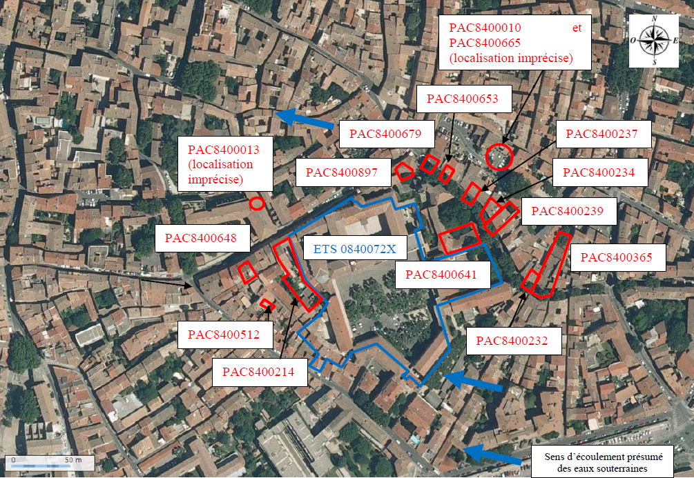 La qualité des milieux au droit de l’établissement a potentiellement été influencée par d’anciennes activités (fabrique de garancine et garage automobile, BASIAS PAC8400214 et d’une teinturerie BASIAS PAC8400641) recensées dans l’environnement de l’établissement. Les investigations réalisées dans le cadre de la démarche « établissements sensibles » (http://www.installationsclassees.developpement-durable.gouv.fr/Demarche-Etablissements-Sensibles.html) au droit de l’établissement ont mis en évidence que des composés volatils (hydrocarbures aromatiques, notamment toluène) ont été quantifiés dans l’air des sols et l’air sous dalle de certains bâtiments. Toutefois, les aménagements actuels permettent de protéger les personnes des expositions aux pollutions. Du plomb (concentrations jusque 220mg/kg) a également été retrouvé dans les sols superficiels. Les diagnostics et études réalisées permettent de conclure que les aménagements et les usages actuels permettent de protéger les personnes des expositions aux pollutions. Néanmoins, des anomalies ont été mises en évidence et si des aménagements ou les usages des lieux venaient à être modifiés il faudrait vérifier la compatibilité des projets avec l’état des sols. |